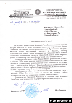 Оцу терахьна тIе а тевжаш, нохчийн меттан нийсаяздаран пакет Microsoft Office-н декъайигар доьхуш Нохчийчоьнан академин президенто Гапуров Шахьруддис бутт хьалха кехат дахьийтина Москох Майкрософтан Оьрсийчуьрчу офисан президенте Боченек Томаше.